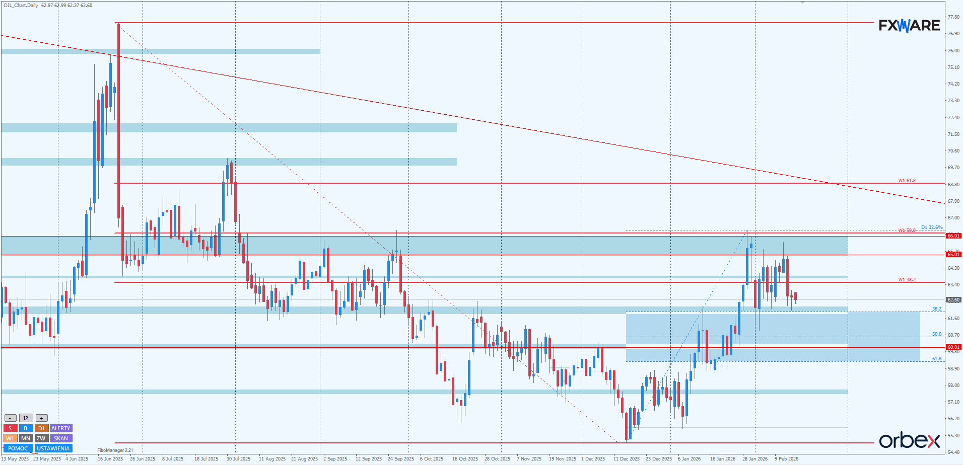 W obliczu istotności tego poziomu, ostatnich reakcji podaży na nim i aktualnego momentum będzie to karkołomne zadanie dla byków. Bardziej prawdopodobne wydaje się wyłamanie z 2-miesięcznego trendu wzrostowego i kontynuowanie spadków w kierunku RN 60$. Nawet kilka dni wzrostów na niewielkim momentum, nieprzekraczających 65$, będzie dla podaży komfortowymi warunkami do rysowania swojego impulsu w dół.