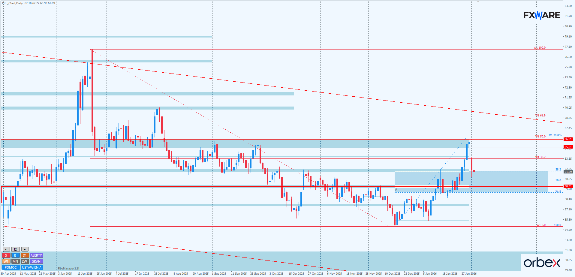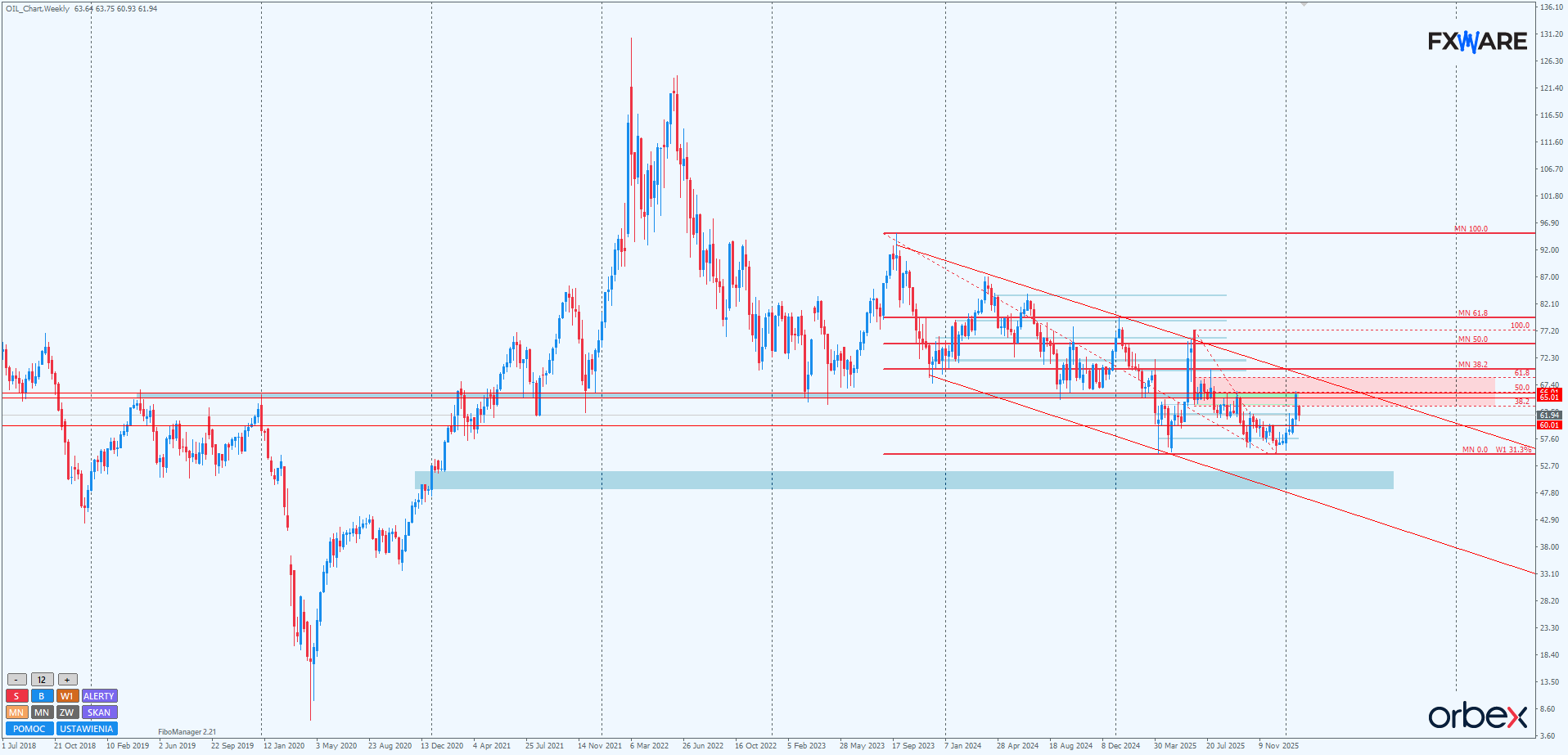 Aktualnie niedźwiedzie zmagają się z najwyższym, z ich perspektywy, poziomem fibo tej strefy 38,2. Przebiega tam również SR na RN 62$. Gdyby od tego miejsca rozpoczęła się korekta, warto obserwować jej początkowe momentum. Dostarczy ono cennych informacji na temat szans byków do ponownego zaatakowania superważnej strefy 65–66$. Spore momentum, porównywalne z tym ze swingu w dół, da szansę bykom na szybki ponowny atak. Wolniejsze, niemrawe odbicie, nawet wielodniowe, ale mające problemy z pokonaniem utworzonej luki otwarcia, wpisze się raczej jako korekta w nowej sekwencji spadkowej ze szczytem na 66$.