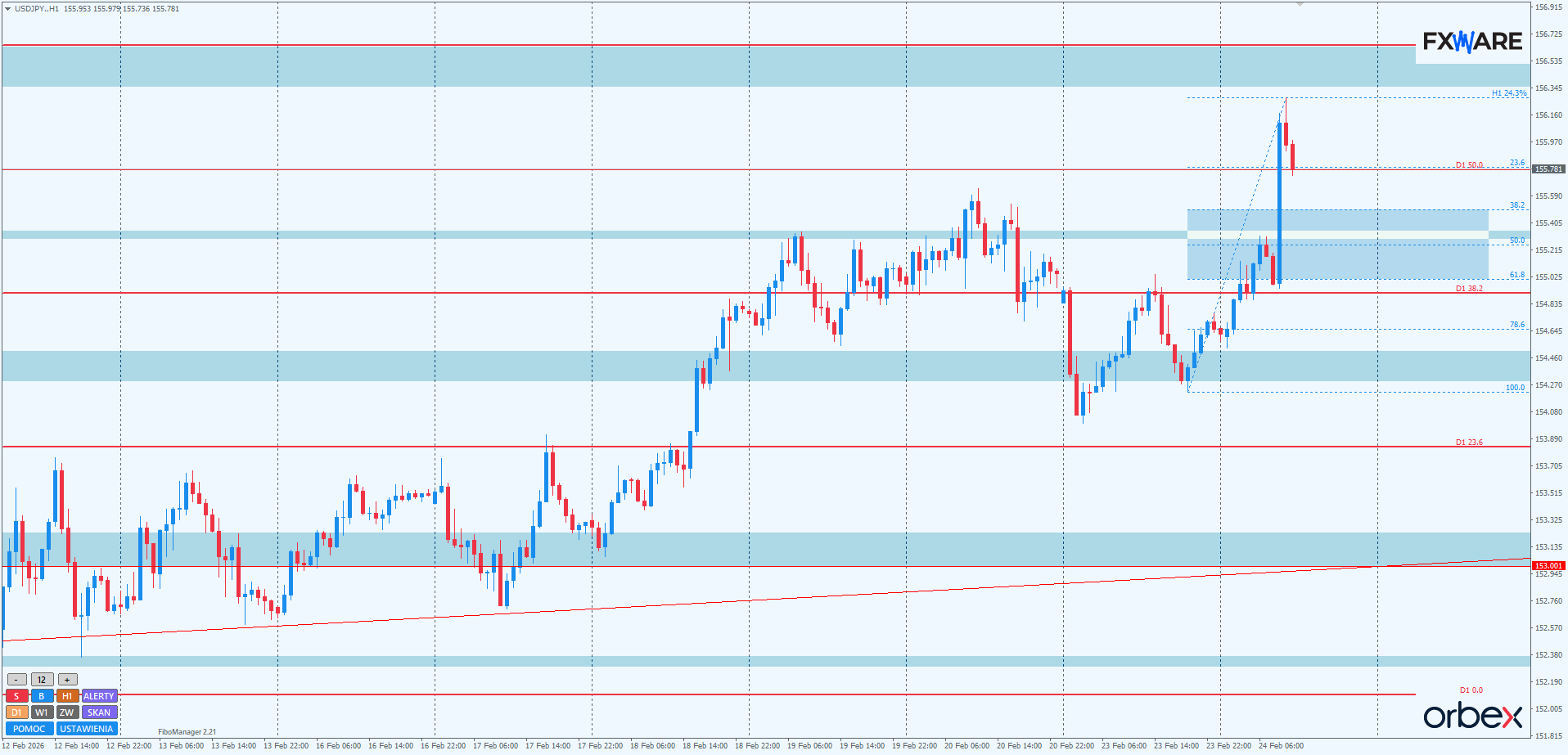 Poziomy zniesień Fibonacciego, zostały automatycznie naniesione za pomocą wskaźnika FiboManager. Jest on także dostępny gratis dla traderów Orbex. Warunkiem jest posiadania aktywnego konta.