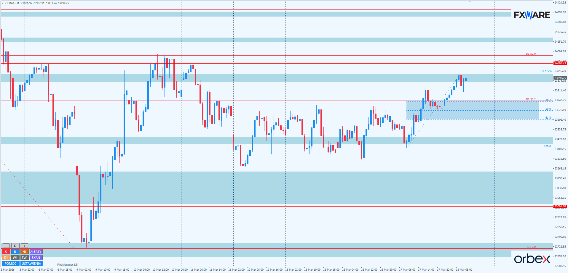 Na H1 wczoraj nastąpiło wyjście górą z 3-sesyjnej strefy konsolidacji. Choć wyjście nastąpiło na sporym momentum, a retest górnej bandy odbył się na słabszym, następujący po tym impuls nie był już równie mocny. To sprawia, że na SR 23900 pojawiło się pierwsze przeciwne momentum podaży. Najbliższe kilka–kilkanaście godzin przyniesie więcej informacji na temat szans byków na pokonanie RN 24000 do końca tygodnia. Nie będzie niczym niezwykłym, jeśli pierwsza próba nie powiedzie się i zakończy się nawet 2–3 sesyjną korektą w kierunku 23750. Nie będzie to przekreślać jeszcze prowzrostowej wymowy sekwencji ostatnich kilku sesji. Może jednak spowodować tak znaczne spowolnienie na wyższych TF, że zmniejszą się szanse na szybkie pokonanie strefy zniesień fibo z D1.