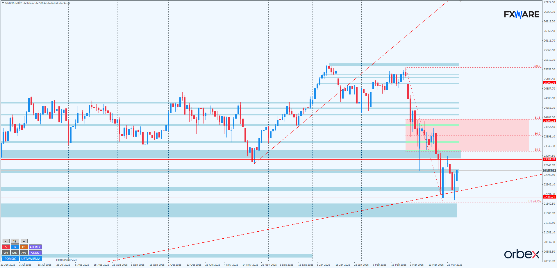 Na wykresie dziennym DAX trwa swing w górę, zainicjowany luką otwarcia na początku tygodnia. Nie zagraża on jeszcze miesięcznej formacji spadkowej z początkiem ponad psychologicznym RN 25000. Sam SR na RN 23000 , który teoretycznie jest w zasięgu byków nawet w ciągu 1 sesji, działa teraz na ich niekorzyść. Zgodnie z ZZB po przełamaniu od góry w impulsowy sposób 20. 03 stał się silnym oporem. Ponadto już dwukrotnie w przeciągu tygodnia miał okazję skutecznie sprawdzić się w tej roli, odrzucając byki 23. 03 i 25. 03. Nie będzie więc dziwić, jeśli sprawdzi się ponownie w tej roli. Choć trzeba bykom przyznać, że momentum, jakie generują od początku tego tygodnia w ruchu w górę, jest równie silne jak impulsy, które sprowadzały cenę w okolice wielomiesięcznej LT.