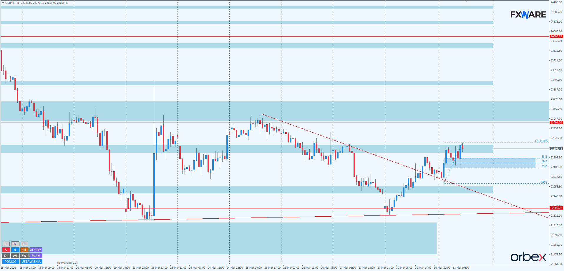 Na H1 bardzo dobrze widoczne jest, jak wielomiesięczna LT i RN 22000 skutecznie oddziałują na podaż. Obie próby pokonania tego miejsca od góry spotkały się z aktywizacją byków. I choć wczorajszy ruch w górę od tego miejsca był wolniejszy niż impuls z 23.03, to wyprowadził byki z niekorzystnego położenia. I to pomimo sprzyjającego wczoraj podaży pokaźnego, pro spadkowego pina. Zanegowanie jego knota ukonstytuowało wyłamanie z korekty i od wczorajszego popołudnia byki rozwijają swój ruch w górę w klasycznej formie, z szybkimi impulsami i korektami na słabszym momentum. Jak na razie nie widać zagrożeń dla tej sekwencji. Choć zarówno SR na 22700, jak i leżący wyżej RN 23000 indukowały już w niedawnej przeszłości impulsowe reakcje niedźwiedzi. Warto więc mieć to na uwadze.