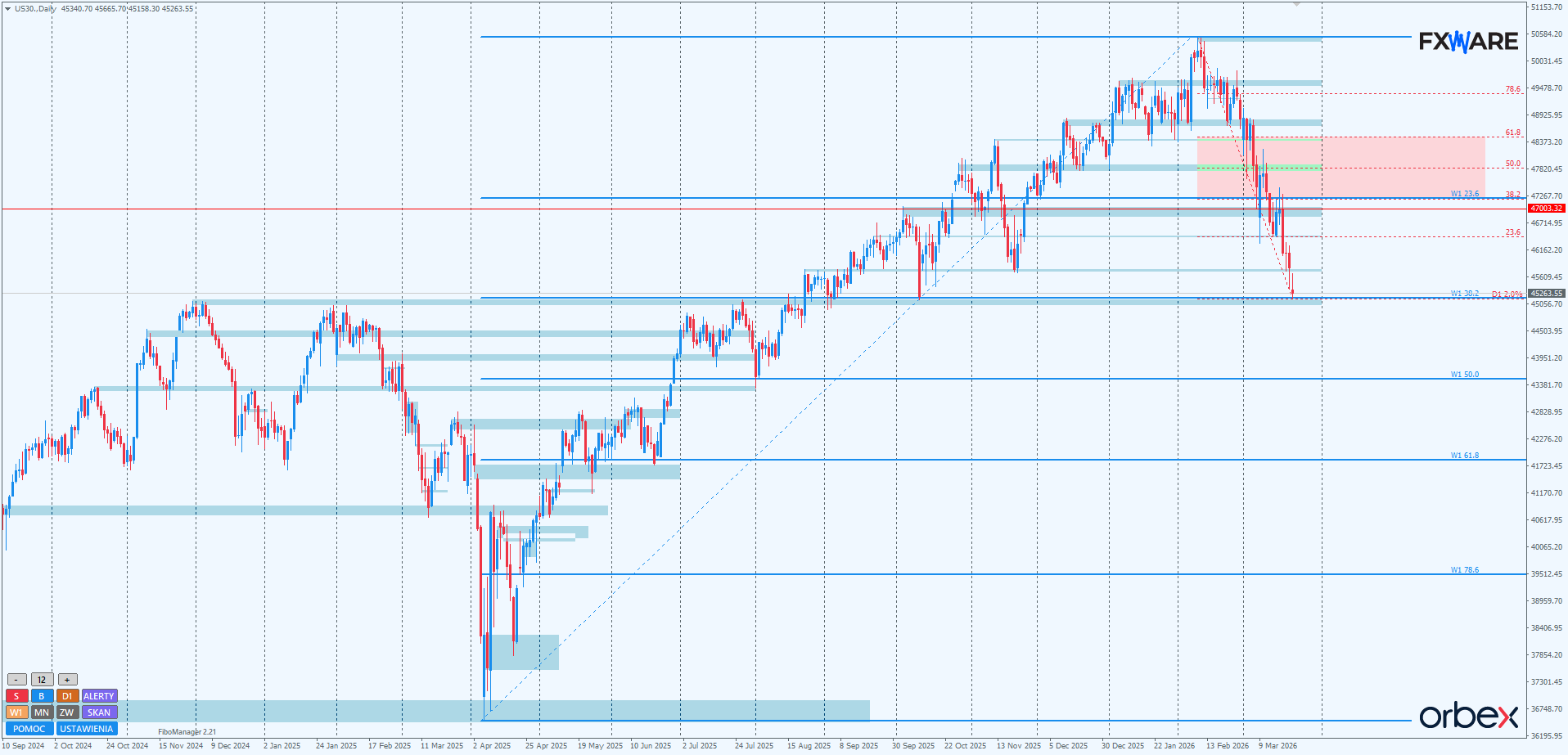 Na wykresie dziennym Dow Jones niedźwiedzie docierają do kolejnego istotnego miejsca. To psychologiczny SR na RN 45000. Miejsce to jednocześnie pokrywa się z poziomem Fibo 38,2 pomiaru tygodniowego swingu, mierzonego od minimów z 2025. To również dolna banda gigantycznej luki z listopada 2025. Są spore szanse, że pierwsze od dłuższego czasu starcie podaży z tym poziomem nastąpi jeszcze dzisiaj. Gdyby niedźwiedziom udało się dokonać zamknięcia daily poniżej RN 45000, miałoby to poważne konsekwencje PA w średnim terminie. Uczynienie z tak istotnego RN oporu byłoby największym sukcesem niedźwiedzi od czasu wyłamania z blisko rocznej sekwencji wzrostowej miesiąc temu.