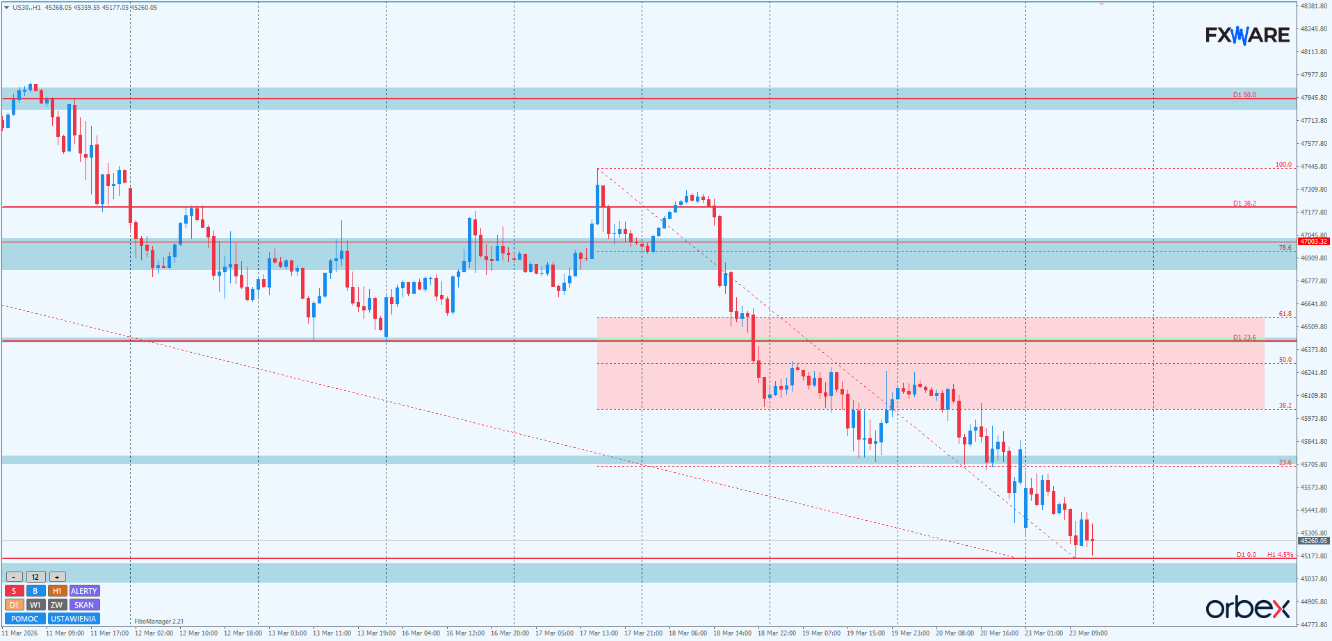 Na H1 niedźwiedzie sukcesywnie ustanawiają od blisko 3 sesji kolejne niższe dołki w swojej sekwencji. Choć momentum nie jest tak mocno impulsowe jak zeszłej środy, kiedy to niedźwiedzie bezdyskusyjnie złamały byki, to jednak na tyle silne, żeby umożliwić podaży przedostanie się poniżej RN 45000 jeszcze w aktualnym swingu. Gdyby nawet doszło do odbicia od 45000, to już 45700 będzie bardzo dogodnym miejscem dla spóźnionych niedźwiedzi do dołączania się do rozpędzonego trendu. Tylko mocne odbicie od RN 45000 i ruch na silnym momentum w górne rejony strefy zniesień Fibo swingu mierzonego od maksimów ubiegłego tygodnia zmieniłby sytuację na ponownie korzystną dla byków. Taki ruch musiałby skutkować zamknięciami świec godzinowych w okolicach 46400-46500, jeśli byki chciałyby poważnie myśleć o przejęciu inicjatywy.