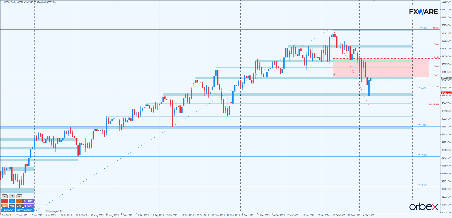 Trwa właśnie korekta ostatniego silnego impulsu w dół. Najbliższe 2-3 sesje będą kluczowe w kwestii określenia momentum reakcji byków. Duże momentum w najbliższych dniach, takie jakie obserwowaliśmy wczoraj, daje szansę na wyłamanie z miesięcznego lokalnego trendu spadkowego. Jednak problemy ze wzrostami w strefie zniesień fibo swingu mierzonego od ATH, szczególnie pomiędzy pivotem a fibo 61,8, mogą oznaczać nowy impuls w dół za kilka dni. Wtedy to jego rozpęd będzie decydujący o szansach ponownego pokonania od góry RN 47000. Być może już na dłużej.