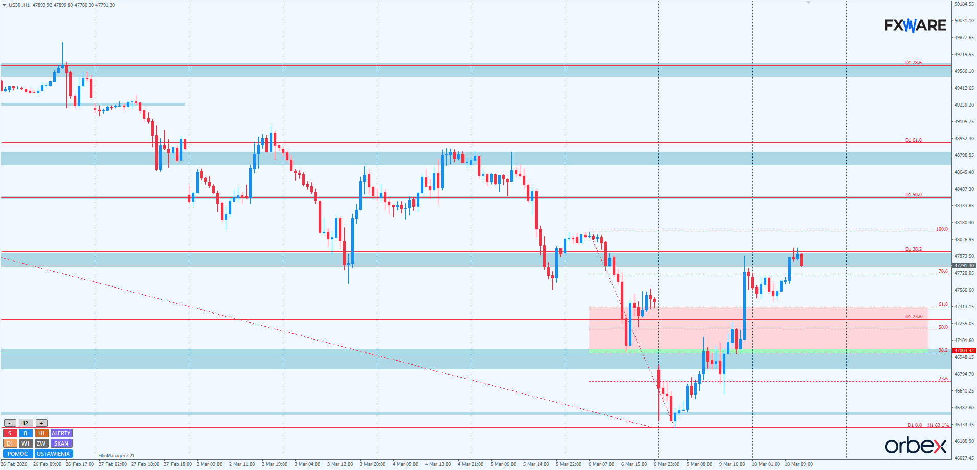 Na H1 wczorajsza mobilizacja byków wywindowała wycenę indeksu do piątkowych poziomów. Najbliższe kilka godzin pokaże, czy momentum byków będzie wystarczające do poważnego zagrożenia strukturze spadkowej z interwału dziennego. Trwa właśnie starcie na SR 47850 i choć pojawił się niewielki prospadkowy pinbar, to ostatnie impulsowe, bardzo wyraźne ruchy były domeną byków. Powyżej tego SR znajduje się obszar FVG z czwartku. Gdyby byki dotarły do niego w impulsie, mógłby mieć katalityczne działanie dla ich dalszych wzrostów i tym samym przesądzić losy miesięcznego trendu. Wszelkie oznaki słabości zarówno na SR 47850, jak i w wyższym obszarze FVG będą promować niedźwiedzie, które ciągle, pomimo wczorajszych wzrostów, mają korzystną sytuację pod względem momentum do swojego impulsu.
