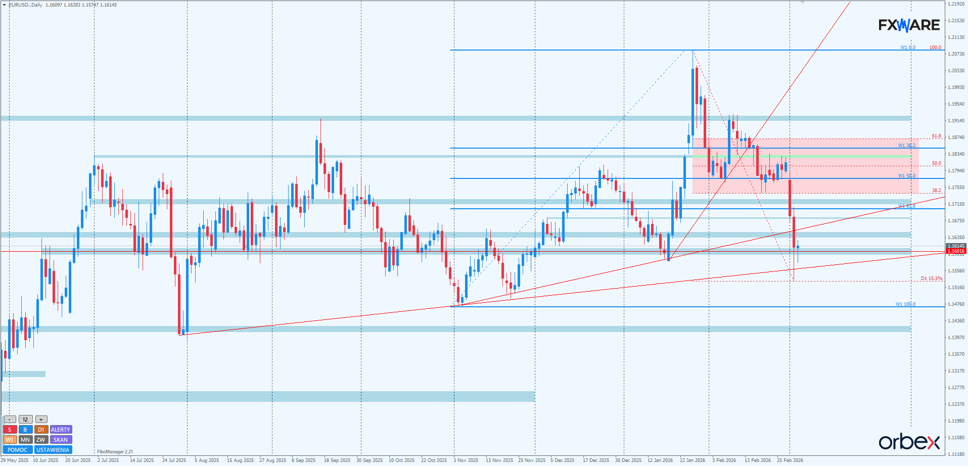 Z kolei zamknięcie daily poniżej 1.16 oznaczać będzie erodowanie albo całkowite wręcz engulfowanie dolnego knota wczorajszej daily. W takim wariancie nawet 1.14 do końca tygodnia mogłoby zostać odwiedzone przez rozpędzone niedźwiedzie. Warto też zwrócić uwagę, że ostatnie 10 sesji przyniosło kolejne wyłamanie sekwencji wzrostowej. Najpierw miesięcznej, przyspieszonej, wczoraj czteromiesięcznej. Na chwilę obecną na granicy wyłamania jest trend 7-miesięczny. Przy obecnym układzie momentum nawet kilka dni wzrostów mogłoby być niewystarczające do zmiany okoliczności na ponownie korzystne dla popytu.