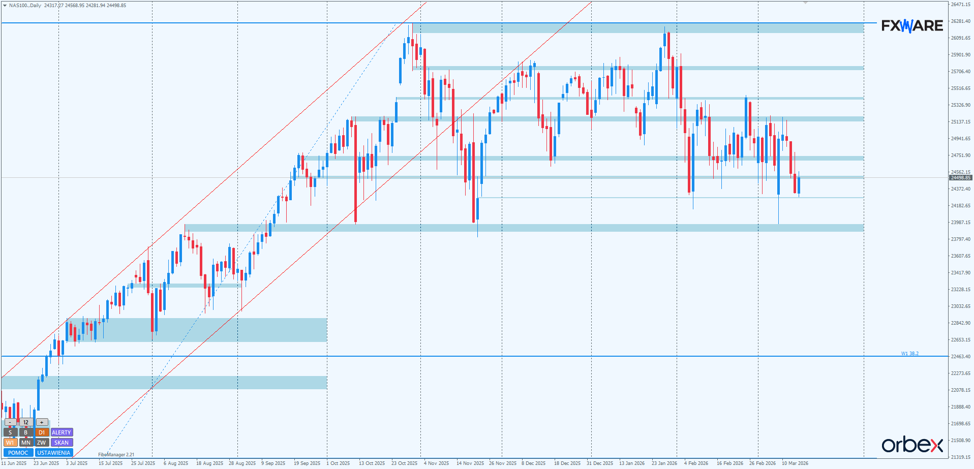 Na wykresie dziennym NASDAQ korekta impulsu z ubiegłego poniedziałku dotarła do lokalnego SR związanego z dolną bandą sporej luki sprzed tygodnia i dolną bandą luki z listopada 2025. Od tego miejsca byki próbują zakończyć tę korektę. Do pełnego sukcesu w tej materii niezbędne jest dla nich sprawne pokonanie od dołu psychologicznego RN 25000. Musiałoby to nastąpić maksymalnie w ciągu 2 sesji, by momentum tego ruchu można było uznać za impulsowe, tym samym rokujące nadzieję na wyłamanie z ponad miesięcznej sekwencji spadkowej.Wolniejsze wzrosty, jeśli by nawet dotarły do 25000, ale trwały kilka dni, umożliwią podaży komfortowe rysowanie jej niedźwiedziego impulsu i głębsze wejście w obszar knota daily z 9.03.Być może nawet zaatakowanie istotnego SR 23900 w celu ustanowienia nowego niższego dołka całej spadkowej sekwencji, która przeniosła wycenę indeksu od górnej bandy do dolnej półrocznej konsolidacji.