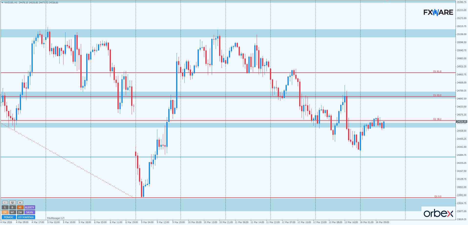 Na H1 pod względem momentum wygląda, jakby 3-sesyjna sekwencja miała być naturalnie kontynuowana. Warto jednak zwrócić uwagę na wzrost momentum na otwarciu. Wystąpił on w obszarze luki i niewielkiej konsolidacji sprzed tygodnia. I choć hamuje on w miejscu dogodnym dla nowego impulsu podaży, to gdyby najbliższe kilka godzin okazało się niemrawe, byki dostałyby dzisiaj szansę na swoją kontrę.Wtedy wejście w obszar FVG z piątku mogłoby doprowadzić do zakończenia aktualnej struktury spadkowej. Kluczowe dla takiego scenariusza byłoby uzyskanie zamknięć na H1 powyżej SR na 24700.