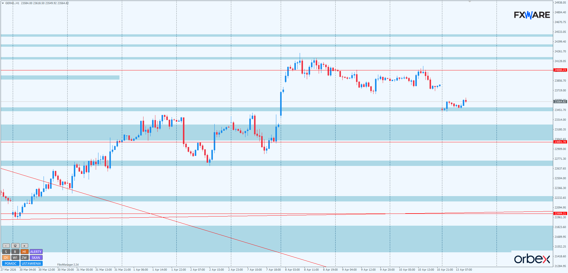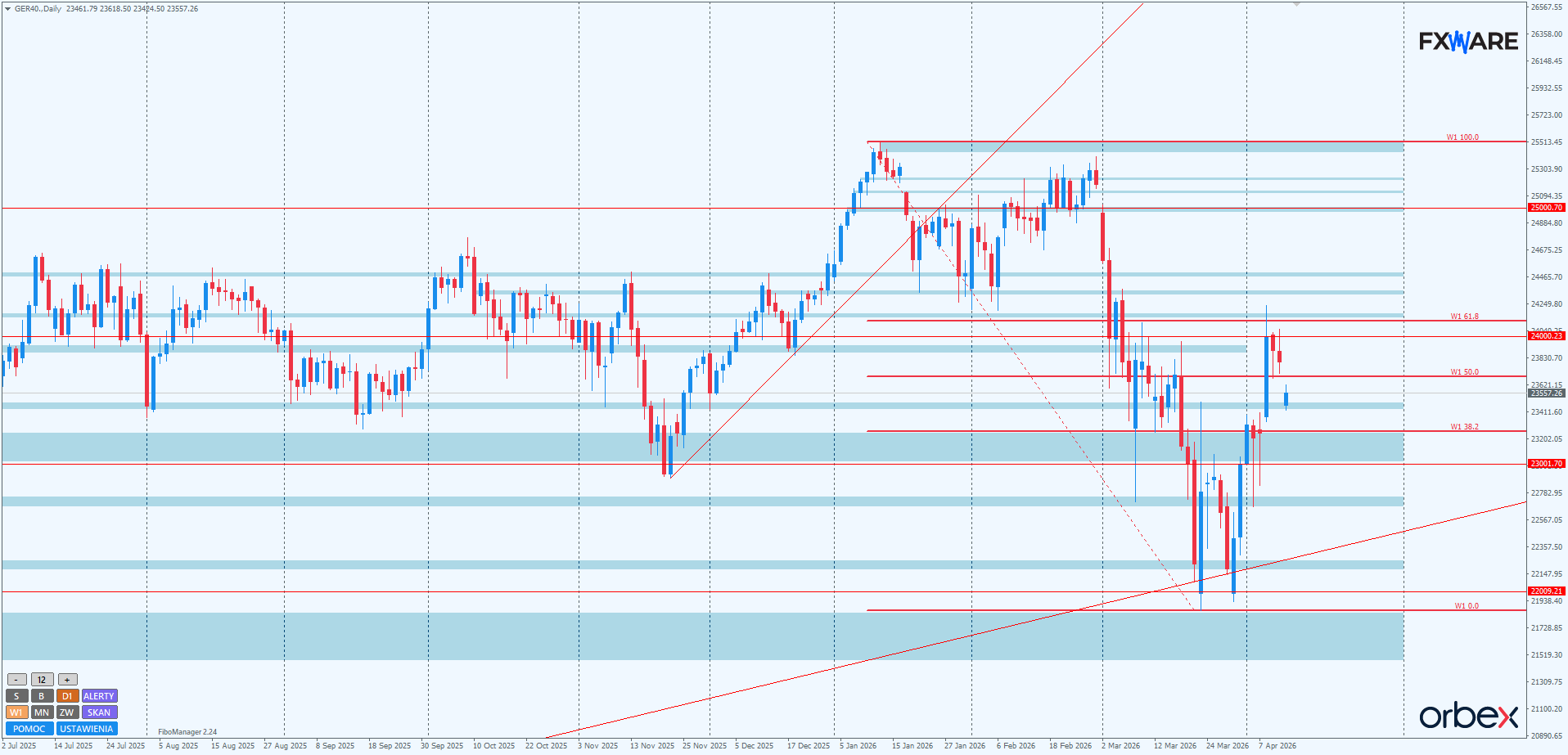 Duży rozpęd i engulfowanie body świecy z piątku zwiększa szanse na szybkie pokonanie RN 24000 i atakowanie obszarów FVG z początku marca. Słabe momentum i problemy z pokonaniem RN 24000 mogą okazać się dobrym przyczółkiem dla podaży do zdobywania w impulsowy sposób luki z ubiegłej środy. Również szerszej, leżącej niżej strefy luki z marca 2025, rozciągającej się od 23000 do 23250. Wielokrotnie działała ona jako wsparcie dla byków. W jej obszarze leżą też prowzrostowe knoty pinów z 2 i 7 kwietnia. Tym bardziej więc nie należy jej ignorować jako miejsca, w którym może ponownie aktywizować się popyt.