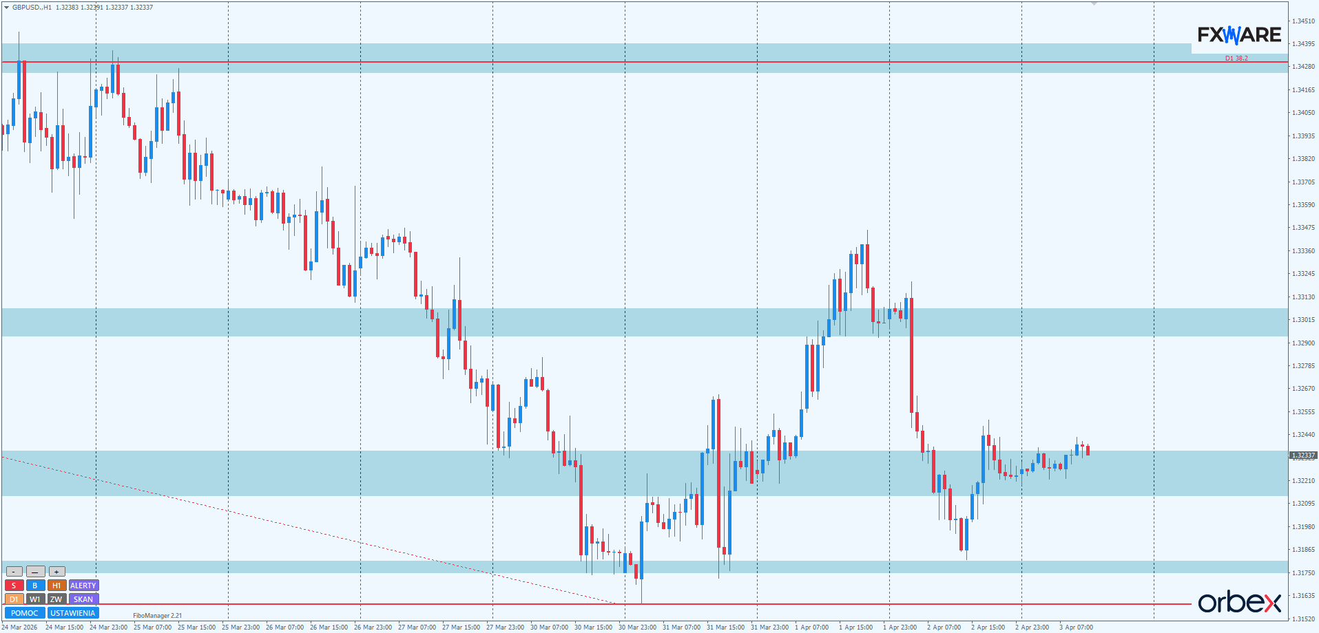 Na H1 SR 1. 31750 wyraźnie sprawia problemy podaży. Bronił się już 3 razy w mijającym tygodniu, choć czy wytworzy się z tego triple bottom dający wzrosty w średnim terminie, jest kwestią dyskusyjną. Wczorajsze zejście podaży do 1. 31750 odbyło się na sporym momentum z pozostawieniem FVG. Odpowiedź byków jest niemrawa, więc o ile nie wystrzelą nagle z impulsem, który wspomniany obszar FVG wykorzysta, większe szanse są na przebicie wsparcia na SR 1. 31750. Gdyby jednak nawet byki dotarły w okolice 1. 33 na sporym momentum przy wykorzystaniu wspomnianego FVG, to dopiero przebicie go, najlepiej z retestem od drugiej strony na mniejszym momentum, dawałoby szanse na wyłamanie z 2-miesięcznego trendu w dół.
