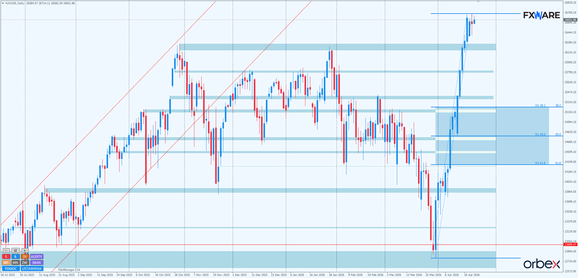 Od początku kwietnia wykres D1 NASDAQ-a to nieustające pasmo sukcesów byków. Odwrót od spadków w formie V-shaped reversala sięgającego RN 23000 zwiastował siłę byków, ale chyba nawet one nie spodziewały się, jak szybko uda im się pokonać drogę od dolnej do górnej bandy wcześniejszej wielomiesięcznej strefy konsolidacji. Praktycznie bez większych korekt byki przeskoczyły od RN 23000 do nowego ATH wczoraj. Wszelkie SR po drodze, tak liczące się jeszcze dla obu stron podczas niedawnej konsolidacji, teraz były pokonywane hurtowo, czasami nawet po dwa kolejne w ciągu jednej sesji. Najcenniejszą zdobyczą byków jest jednak pokonanie na sporym momentum SR 26200. To poziom związany ze szczytami z października 2025 i stycznia 2026. Tworzyły one double top, który rozpoczął falę spadków od początku roku.