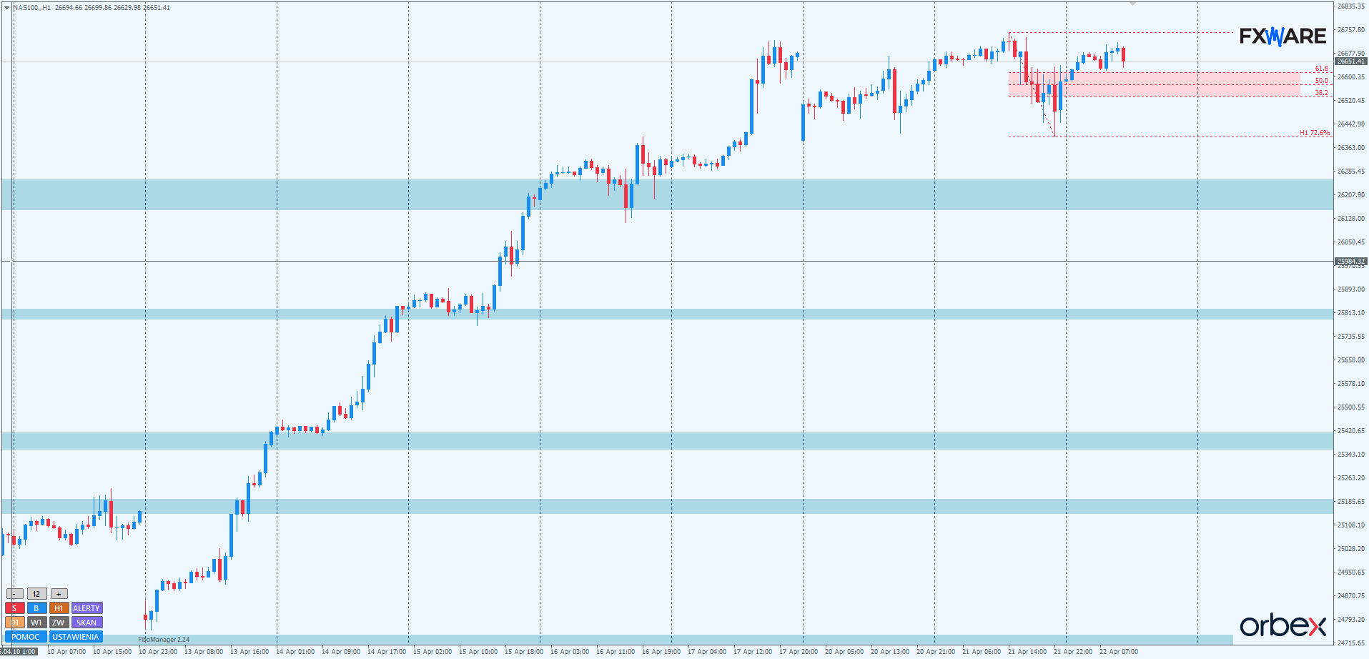 Na H1 jak na razie trwa od 3 sesji konsolidacja, utrzymuje się w zakresie zbliżonym do szerokości weekendowej luki. Widać jednak, że w momencie zbliżania się wyceny indeksu do górnej bandy, czyli okolic 26700, to podaż aktywuje się bardziej mocnymi impulsowymi ruchami. Nie są one jak na razie wystarczające do pokonania dolnej bandy, ale większe momentum podaży jest wyraźnie widoczne. Takie zjawisko miało miejsce zarówno w poniedziałek, jak i wczoraj w godzinach wieczornych. Do momentu więc opuszczenia zakresu konsolidacji obie strony mają szanse na wyrysowanie decydującego swingu w swoją stronę, choć podaż wydaje się być trochę bardziej zdeterminowana, by uczynić to jako pierwsza. Sytuację na bardziej korzystną dla byków zmieniłoby pokonanie na sporym momentum 26700 i zretestowanie go od góry. Wtedy można by mówić o lokalnej porażce niedźwiedzi, która mogłaby przełożyć się na ruchy na wyższym TF.