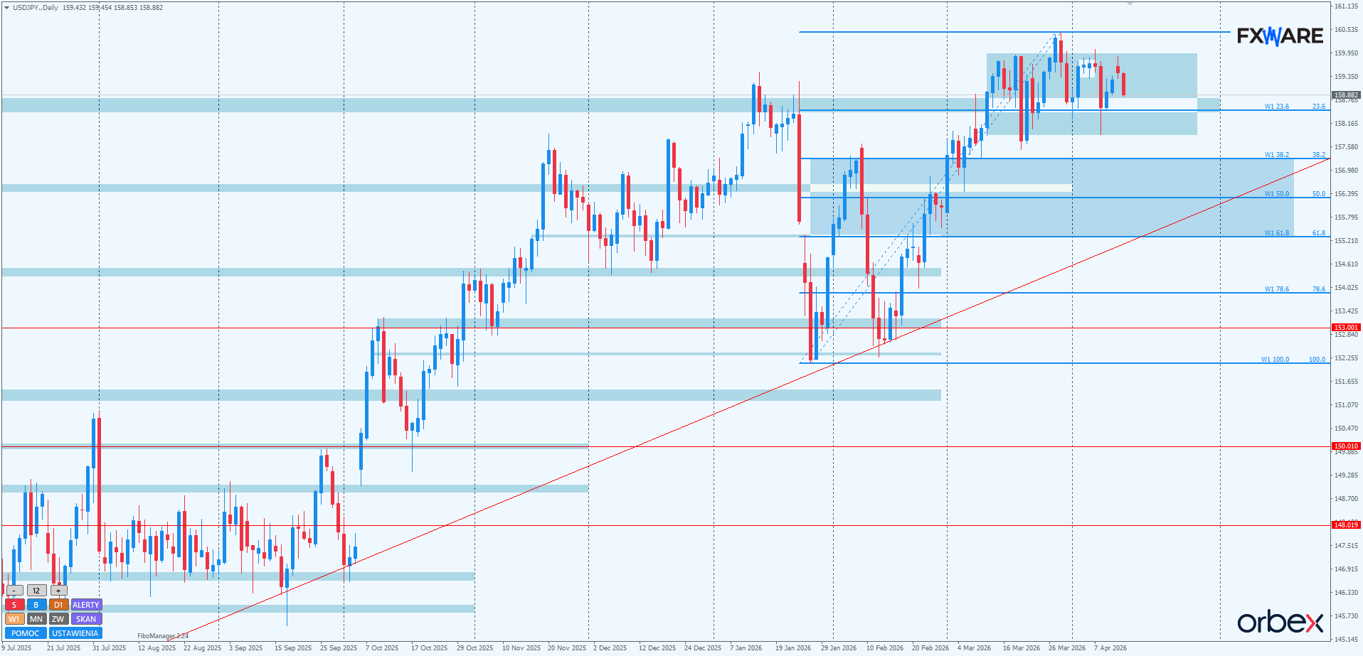 Na wykresie dziennym USDJPY trwa od blisko miesiąca konsolidacja. Jej zakres to 159. 900 od góry i 157. 900 od dołu. Jedyne, symboliczne wyjścia miały miejsce jednokrotnie dla każdej ze stron i na nie więcej niż kilka godzin. Jednocześnie ostatni ruch od górnej do dolnej bandy jest w formie klasycznej struktury spadkowej z wyraźnie widocznymi impulsami. W poniedziałek, pomimo otwarcia prowzrostową luką nowego tygodnia, nie została ona wyłamana. Stawia to podaż w odrobinę lepszej sytuacji co do perspektyw opuszczenia tej konsolidacji. Na 158. 500 leży też SR, konfluencyjnie z poziomem fibo 23,6 swingu mierzonego od styczniowych minimów. Choć od początku kwietnia broni się dzielnie jako wsparcie, nie będzie niczym niezwykłym, jeśli w najbliższych dniach, poddany kolejnej próbie, padnie.