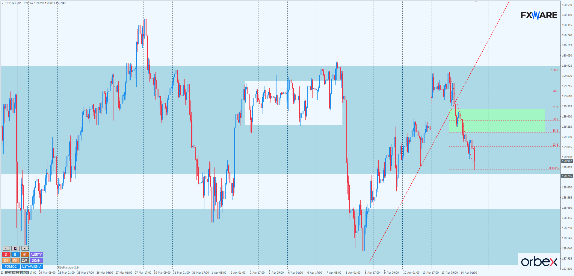 Na H1 doszło do zamknięcia prowzrostowej luki otwarcia nowego tygodnia i wyłamania z dotychczasowej formy kilkusesyjnego lokalnego trendu w kierunku górnej bandy konsolidacji. Sam ruch, który tego dokonał, nie jest jakoś wybitnie szybki, na pewno wolniejszy niż impuls sprzed tygodnia. Nie będzie więc dziwić, jeśli w okolicach 158. 600 – 158. 700 dojdzie do reakcji popytu. Gdyby jednak do takiej reakcji nie doszło, a momentum podaży nabrało większych rumieńców, bykom ciągle pozostaje dolna banda konsolidacji z D1 w okolicach 157 .800 jako miejsce ostatecznej obrony. Z racji przebywania w takiej większej konsolidacji wszelkie gwałtowne zmiany momentum, podobne do tych, jakie miały miejsce w pierwszym tygodniu kwietnia, nie powinny dziwić, a lokalne SR czy strefki konsolidacji mogą być łatwo pokonywane. Do momentu opuszczenia strefy konsolidacji jej rejon pozostanie trudnym środowiskiem dla obydwu rynkowych stron, szczególnie w sytuacji jak obecna, gdy żadna ze stron nie ma poważnych krótkoterminowych argumentów za swoim kierunkiem.